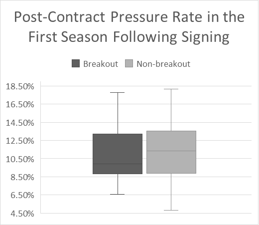 Despite receiving significantly higher compensation, breakout players did not deliver superior post-contract performance. In the first season following signing, breakout players recorded a median sack rate of 1.04%, compared to 1.85% for non-breakout players. Similarly, breakout players posted a lower median pressure rate (9.9%) than non-breakout controls (11.33%). The distribution of first-season pressure rates further illustrates this result, showing substantial overlap between breakout and non-breakout players and no upward shift in typical post-contract pass-rush efficiency for breakout signings.