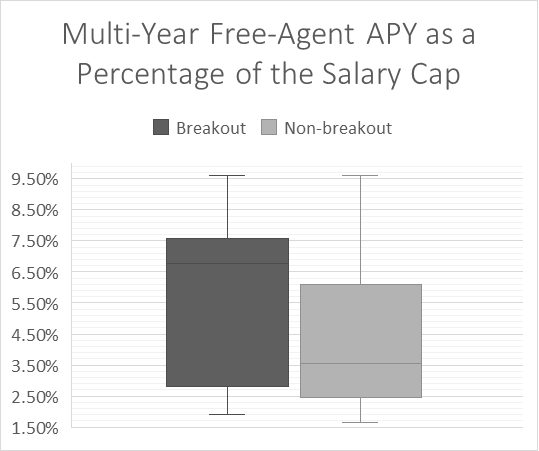 Among players who received multi-year contracts, breakout players were compensated at substantially higher levels. The median salary-cap–adjusted average annual value (APY) for breakout players was 6.76% of the salary cap, compared to 3.73% for non-breakout controls—an increase of approximately 81%.